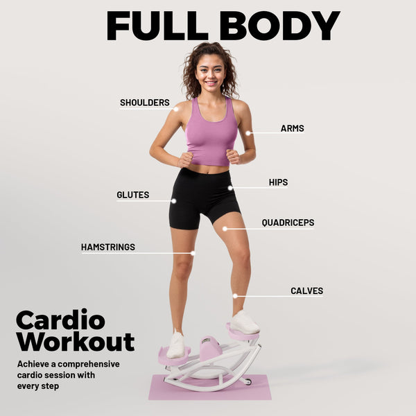 The Rock Stepper features a lateral rocking motion that engages legs, glutes, and core simultaneously, providing a more comprehensive workout than traditional steppers.